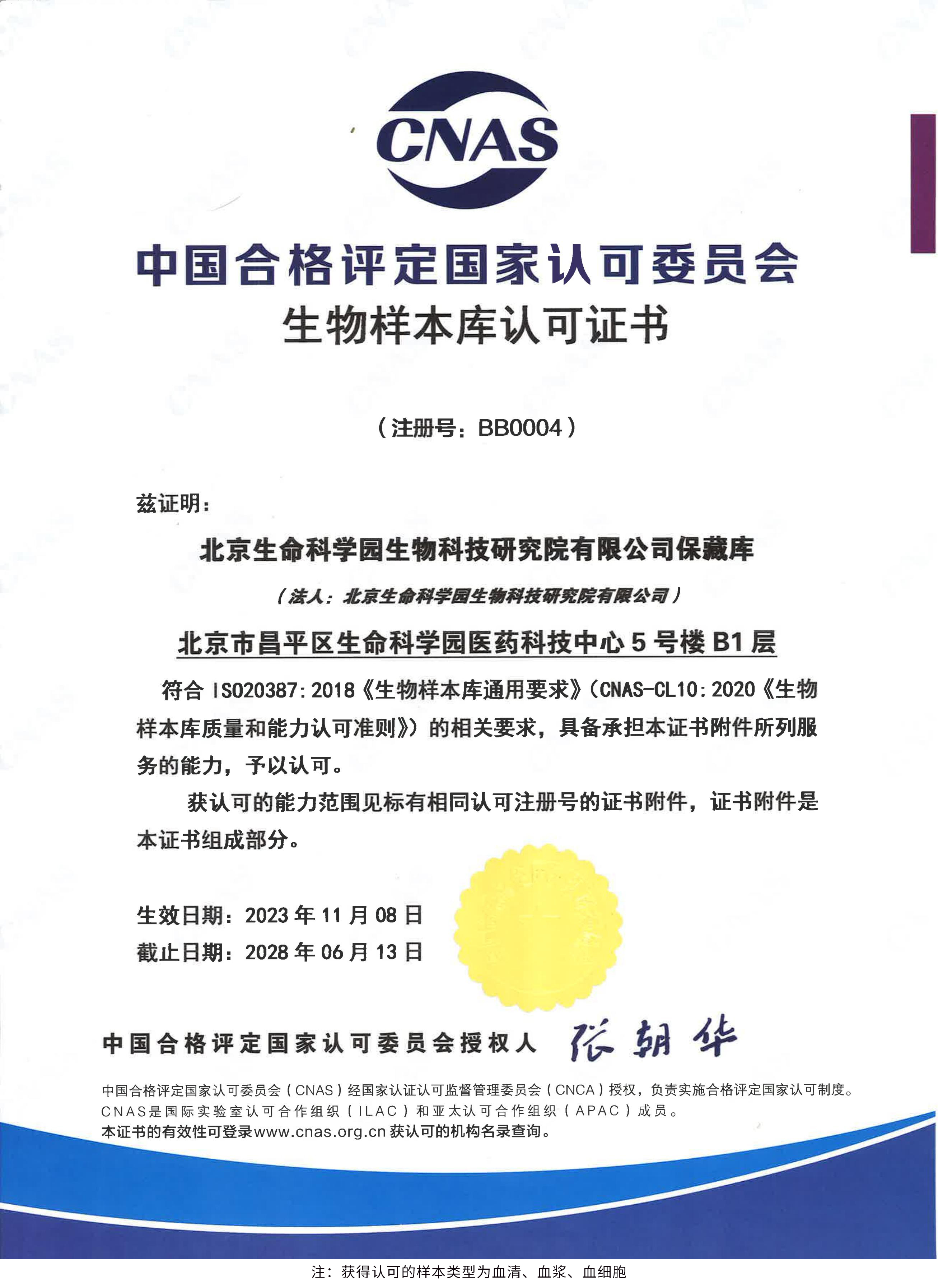 北京生命科學園生物科技研究院(以下簡稱“北京生物樣本資源庫”)(Biobank of Life Science Park,簡寫“BoLSP”)是一家由北京市科委和中關村生命科學園共同支持設立的第三方生物樣本庫公共服務平臺,秉承北京重大疾病臨床數(shù)據(jù)和樣本資源庫(以下簡稱“北京庫”)(Beijing Biobank of Clinical Resources,BBCR)十余年的發(fā)展成果,聚合眾多臨床樣本專家的專業(yè)共識,致力于在生命科學、生物醫(yī)藥研究領域發(fā)揮銜接樣本資源持有者與研究者的橋梁作用,解決生物樣本資源開發(fā)上下游信息不對稱、資源共享困難等問題。研究院在北京中關村生命科學園昌平園區(qū)建立了2000㎡生物樣本庫,最大存儲規(guī)模達1000萬份。研究院遵循CNAS-CL10:2020《生物樣本庫質(zhì)量和能力認可準則》,同時結(jié)合北京庫過去十年的工作經(jīng)驗與教訓,建立了一套完善的生物樣本保藏質(zhì)量管理體系,從人、機、料、法、環(huán)、控多個角度,實現(xiàn)生物樣本保藏過程的全面質(zhì)量控制,先后獲得國家科技部頒發(fā)的人類遺傳資源保藏行政許可證書和中國合格評定國家認可委員會(China National Accreditation Service for Conformity Assessment,CNAS)頒發(fā)的“CNAS認可證書”。